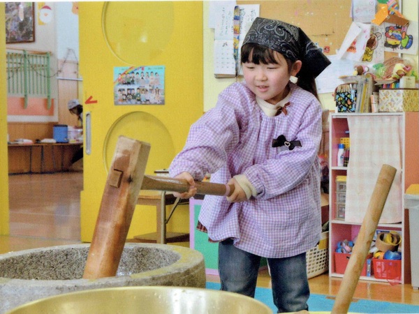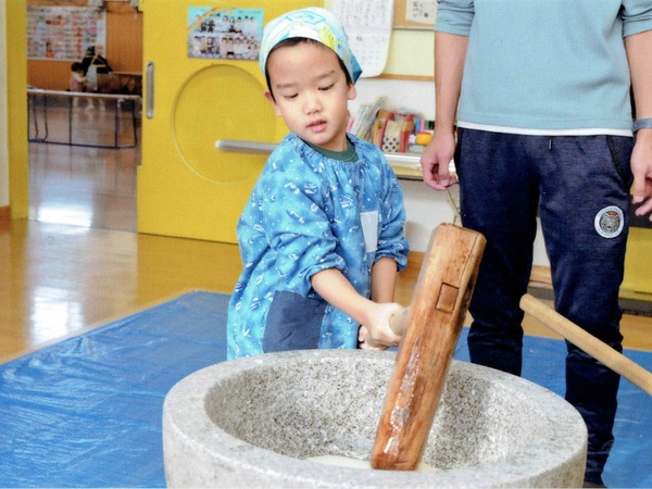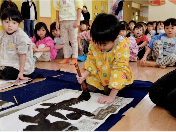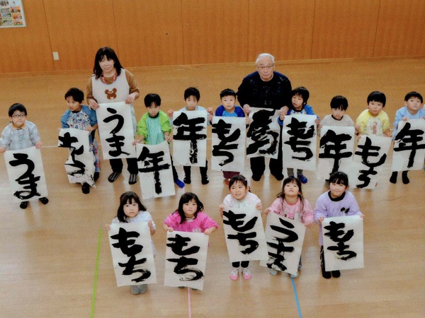2025/12/23 書初め・おもちつき 12月は年中行事体験がたくさん!おもちつき会ではもちつき体験、お昼ご飯で食べました!書初めでは大きな筆で「うま・もち・年」など元気いっぱい書き上げました。 1 2